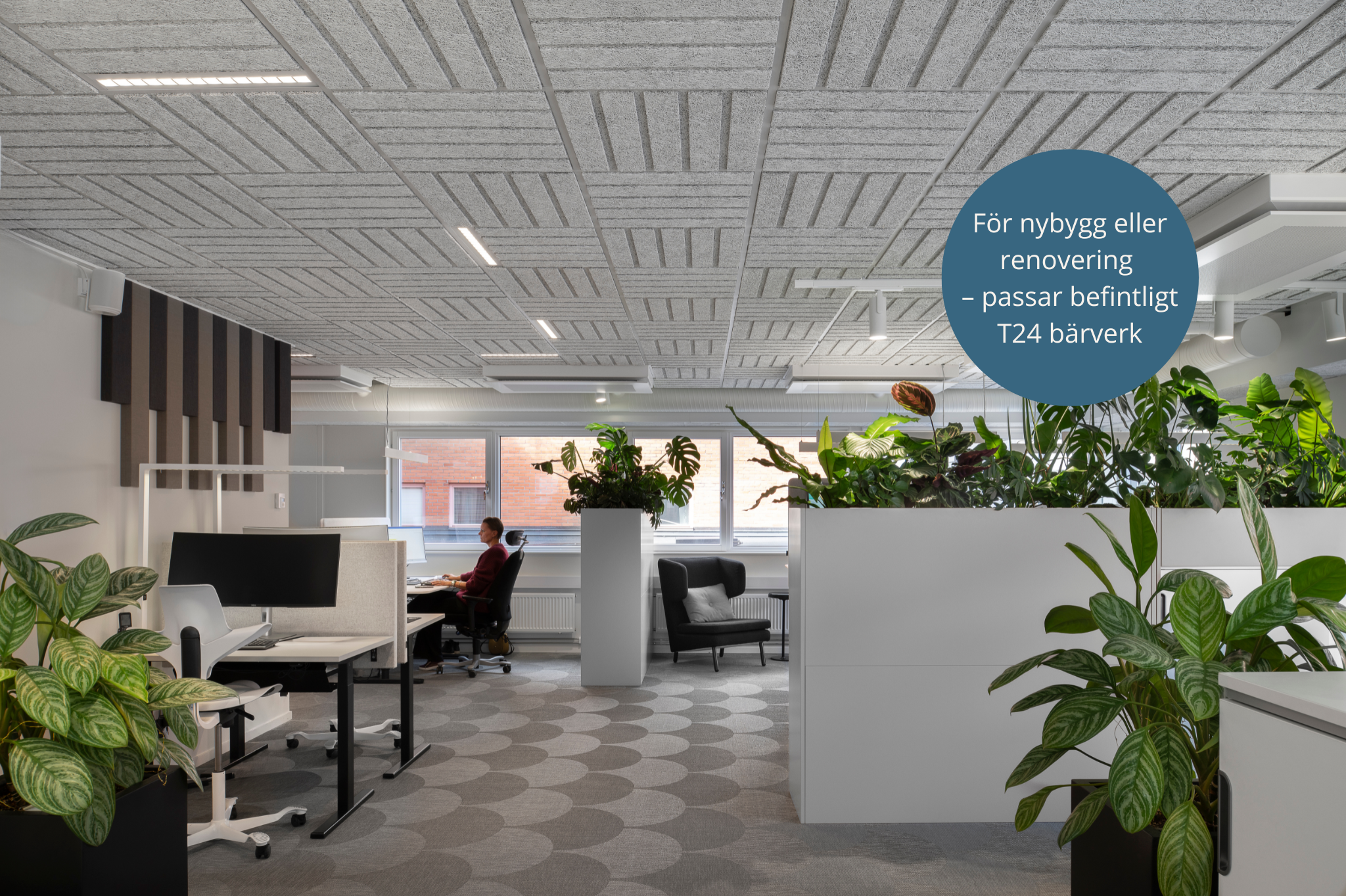 Tiles T24 kan användas tillsammans med det T24‑bärverk som redan finns på plats, vilket gör lösningen (kostnads)effektiv vid både renovering och uppgradering.*